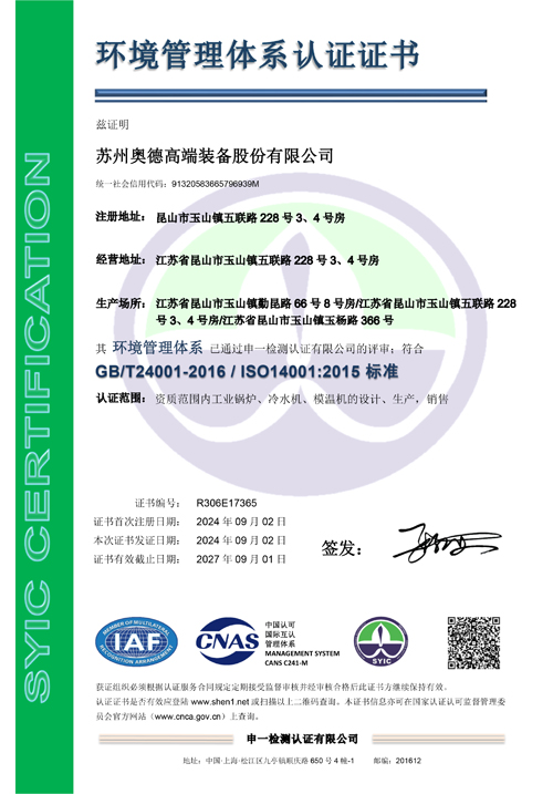 10月奧德昆山平謙廠區投入生產 成立鍋爐事業部